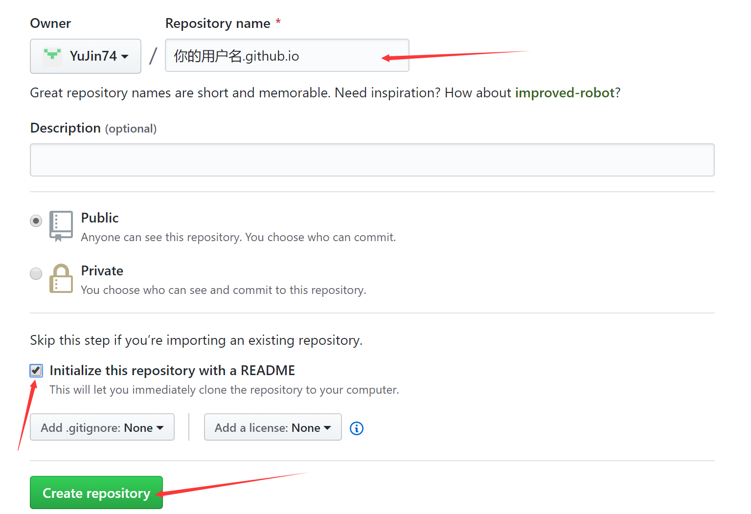 如图所示,输入项目名称,比如你的github名字叫yaya,那么项目的名称就要叫yaya.github.io,勾选默认生成README,最后点击绿色小按钮就完成了。