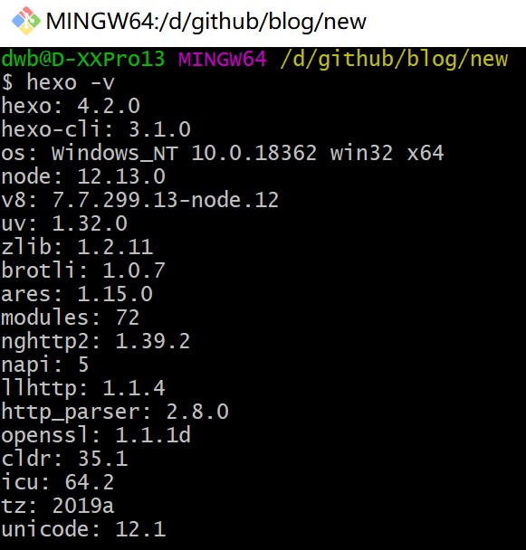 输入npm i hexo-cli -g来安装hexo,过程可能比较久,耐心等待。安装完成后 输入hexo -v验证是否安装完成。